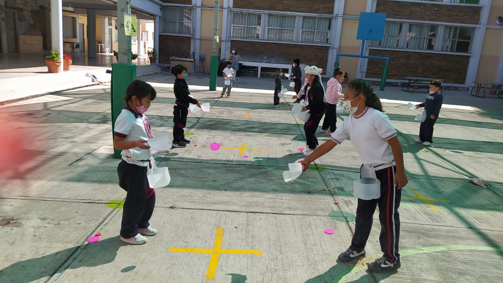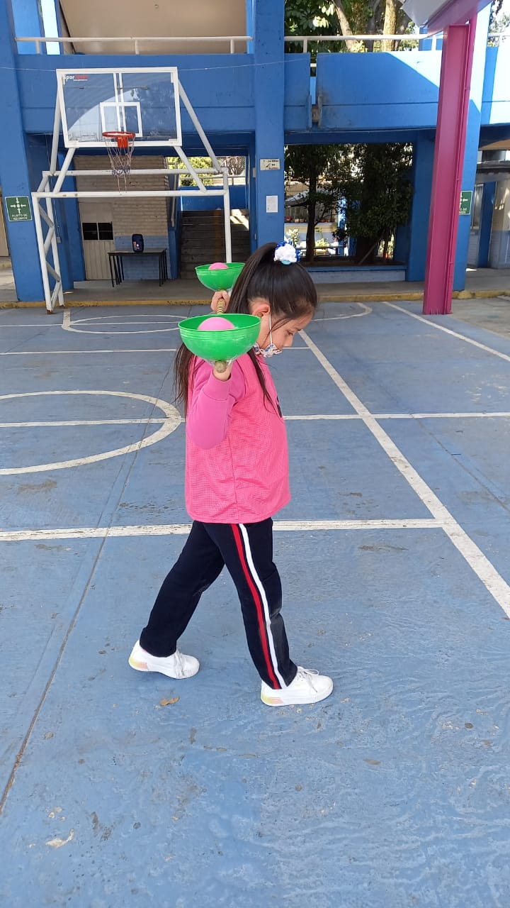 La profesora Ana Luisa Zárate nos comparte un implemento que se utiliza para diversos juegos. Es un galón de plástico con dos cortes. Se puede apoyar en un hilo que se amarra al cuerpo para jugar a atrapar una ficha realizando movimiento de cadera. Ana Luisa propone también el juego “Limpiando la casa” donde distribuye fichas en lugares aleatorios en la cancha y por equipos tienen que recoger la mayor cantidad posible. Estos juegos fortalecen la coordinación óculo-manual, el trabajo cooperativo y la comunicación entre alumnos.